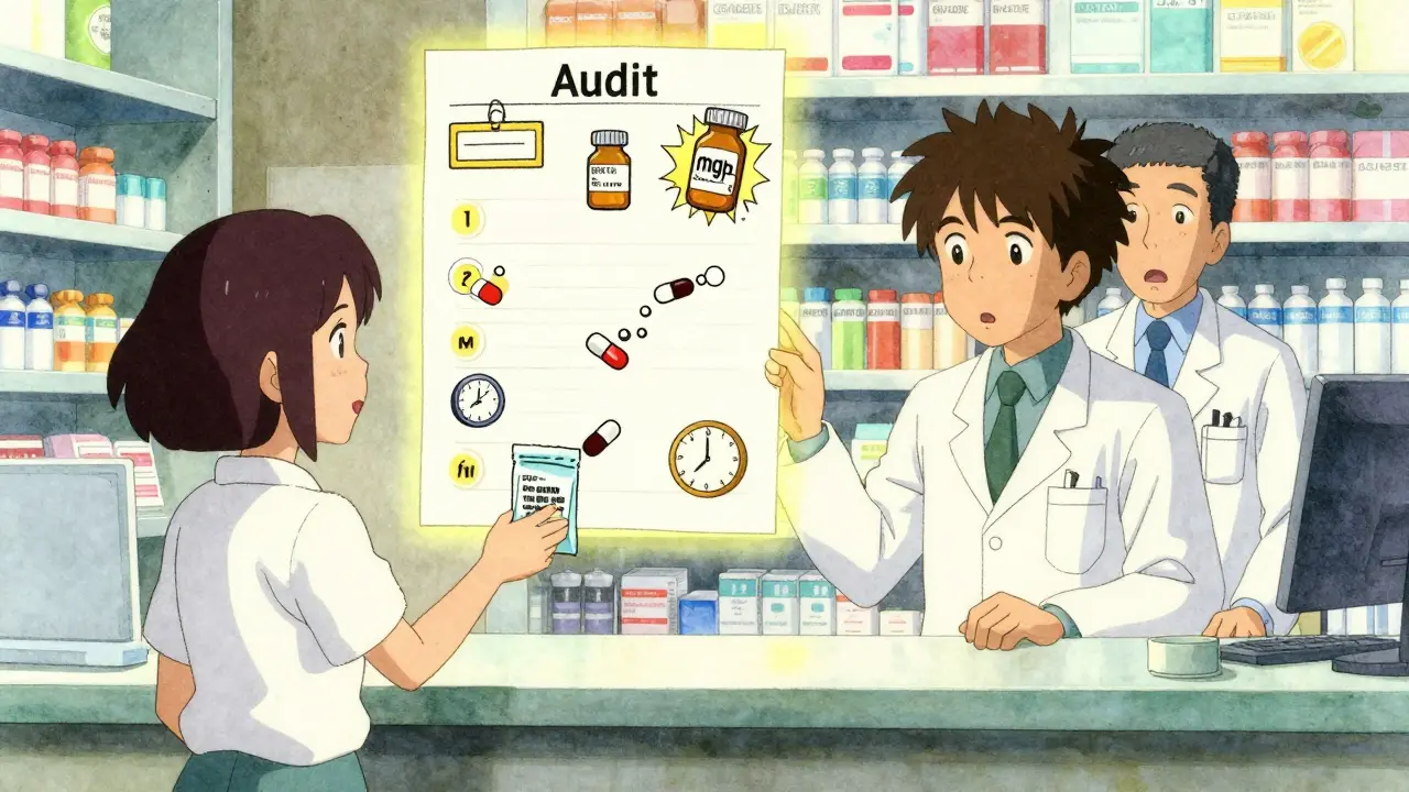 You’ve probably heard stories about someone taking too much of a pill because the label said "5" instead of "5 mg" - or worse, they took someone else’s medicine because their names sounded alike. These aren’t rare accidents. According to the Institute for Safe Medication Practices, 12.7% of errors involve the wrong patient, and 32% involve dosage mistakes. A 2024 JAMA Internal Medicine study found that when patients check their meds before leaving, they catch nearly nine out of ten errors. That’s not luck. It’s a system that works - if you use it.The 7-Point Medication Audit Checklist