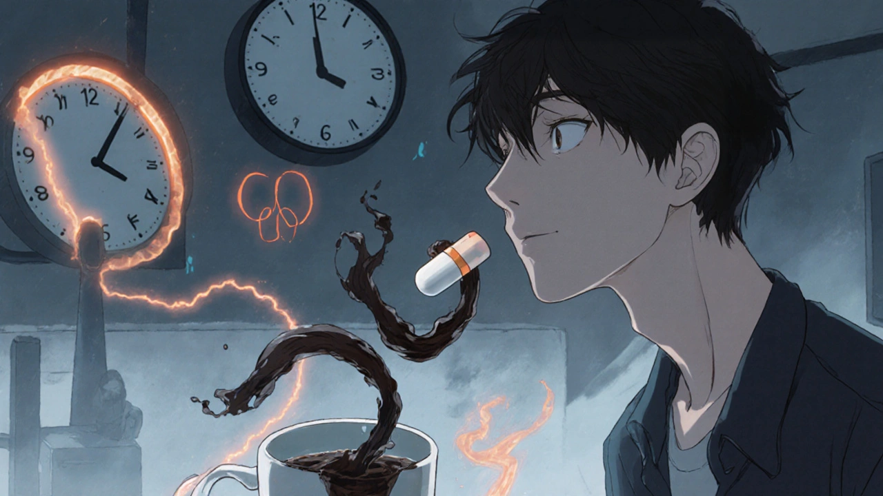 Levothyroxine is a synthetic version of the thyroid hormone T4. Your body needs it to regulate metabolism, energy, and mood. But this hormone doesn’t just float through your gut and get absorbed like sugar. It needs the right environment. Coffee, especially caffeinated, messes with that environment. The problem isn’t just caffeine. It’s the polyphenols and chlorogenic acids in coffee. These compounds bind to levothyroxine in your stomach and small intestine, forming a complex your body can’t absorb. Think of it like Velcro-the drug gets stuck to coffee particles instead of slipping into your bloodstream. Studies show that when people take levothyroxine and drink coffee at the same time, their peak T4 levels drop by 30% or more. The time it takes for the drug to reach its highest concentration in the blood is delayed by nearly 40 minutes. That’s not just inconvenient-it’s clinically significant. Even decaf coffee causes interference. That’s because the issue isn’t caffeine alone-it’s the coffee itself. Decaf still contains those same binding compounds and stimulates your colon faster, which pushes the medication through your gut before it has time to be absorbed.How Long Should You Wait?